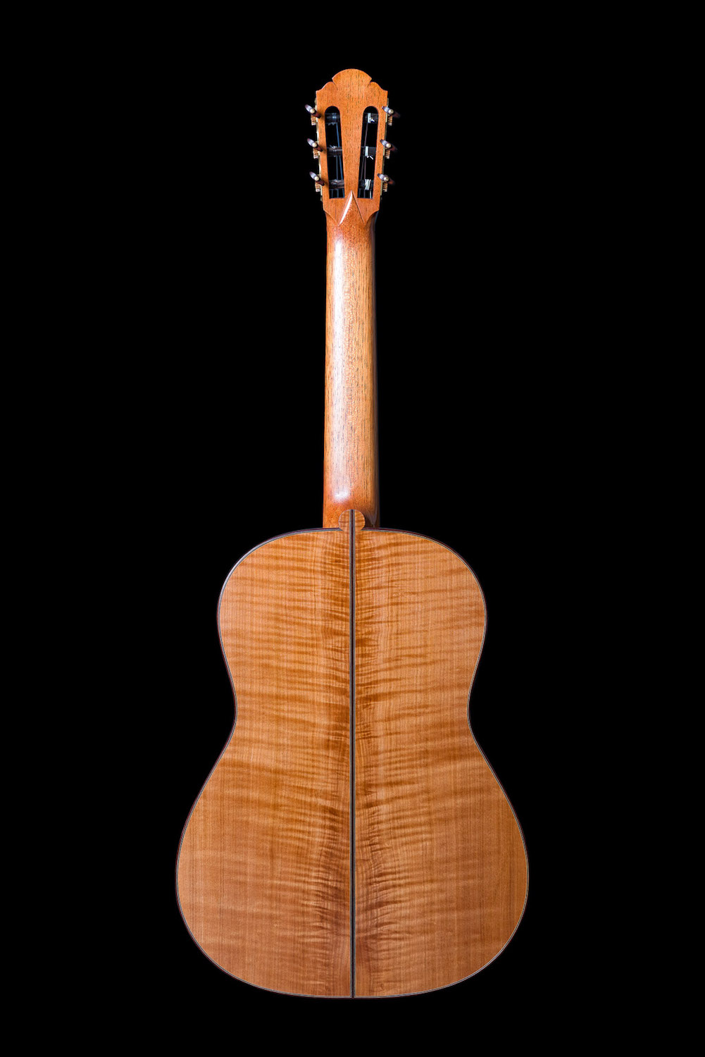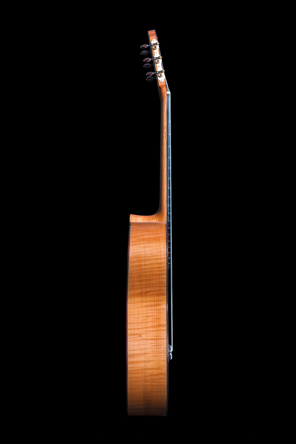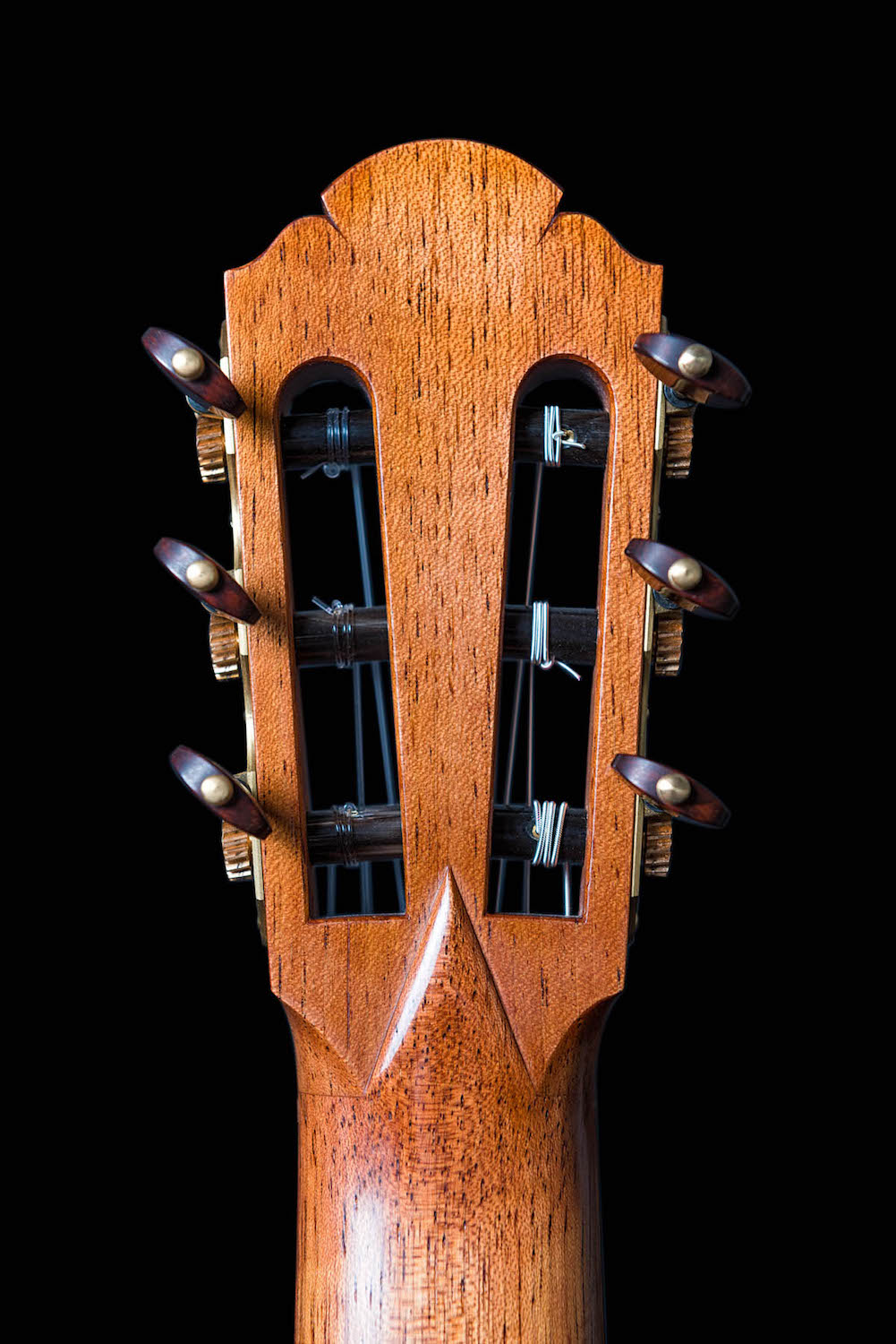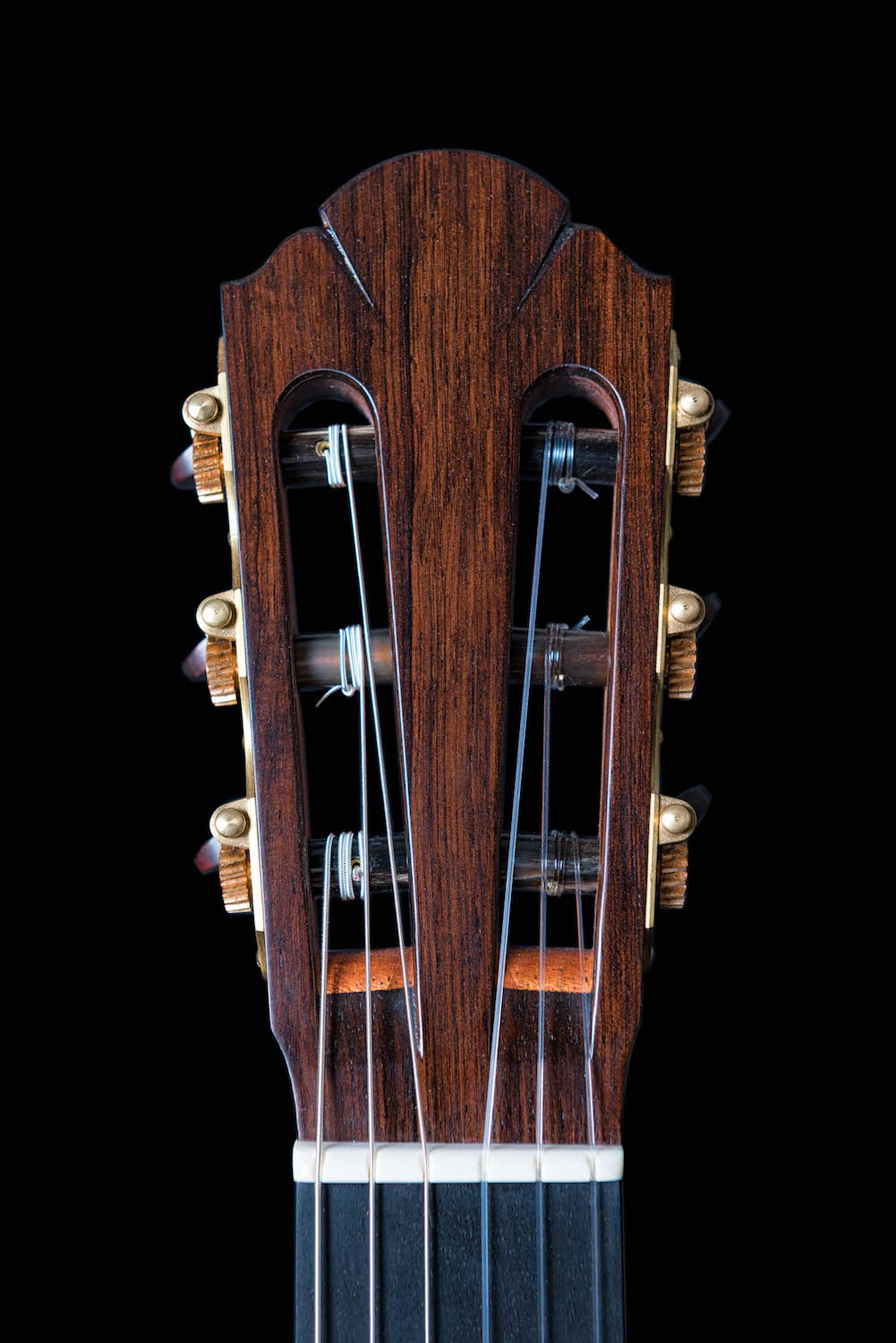 This guitar with cedar soundboard is the very first I have made with back and sides of one of the most magical woods I know: sorb tree, also called whitty pear or, with its botanic name, sorbus domestica. Some further information about this wood can be found on my blog page. Tuners: Scheller with snakewood buttons.