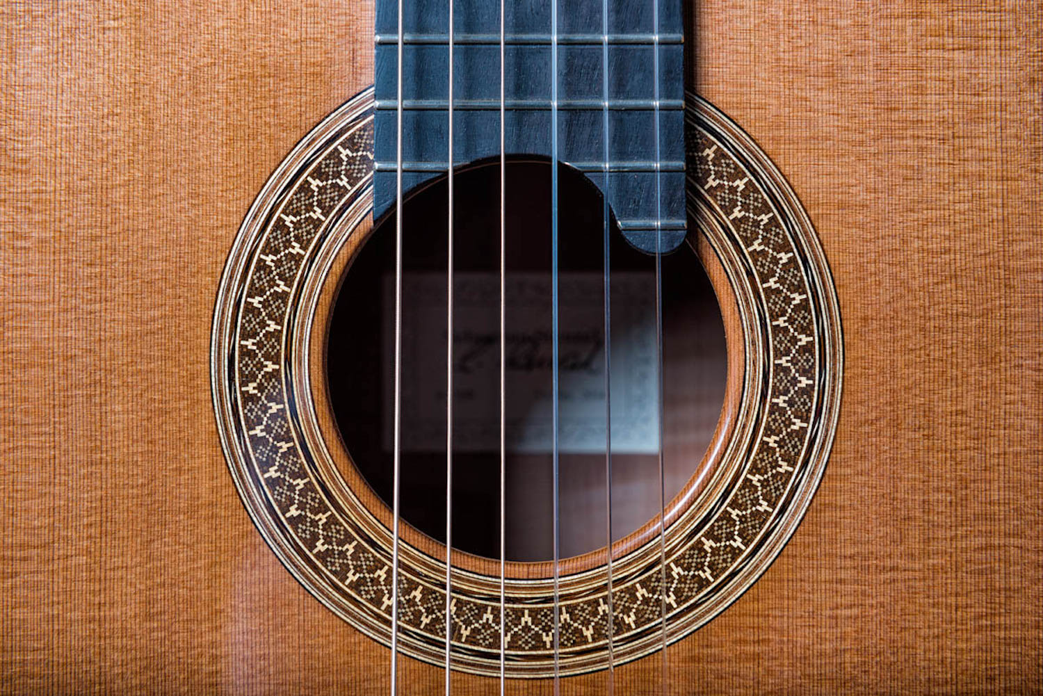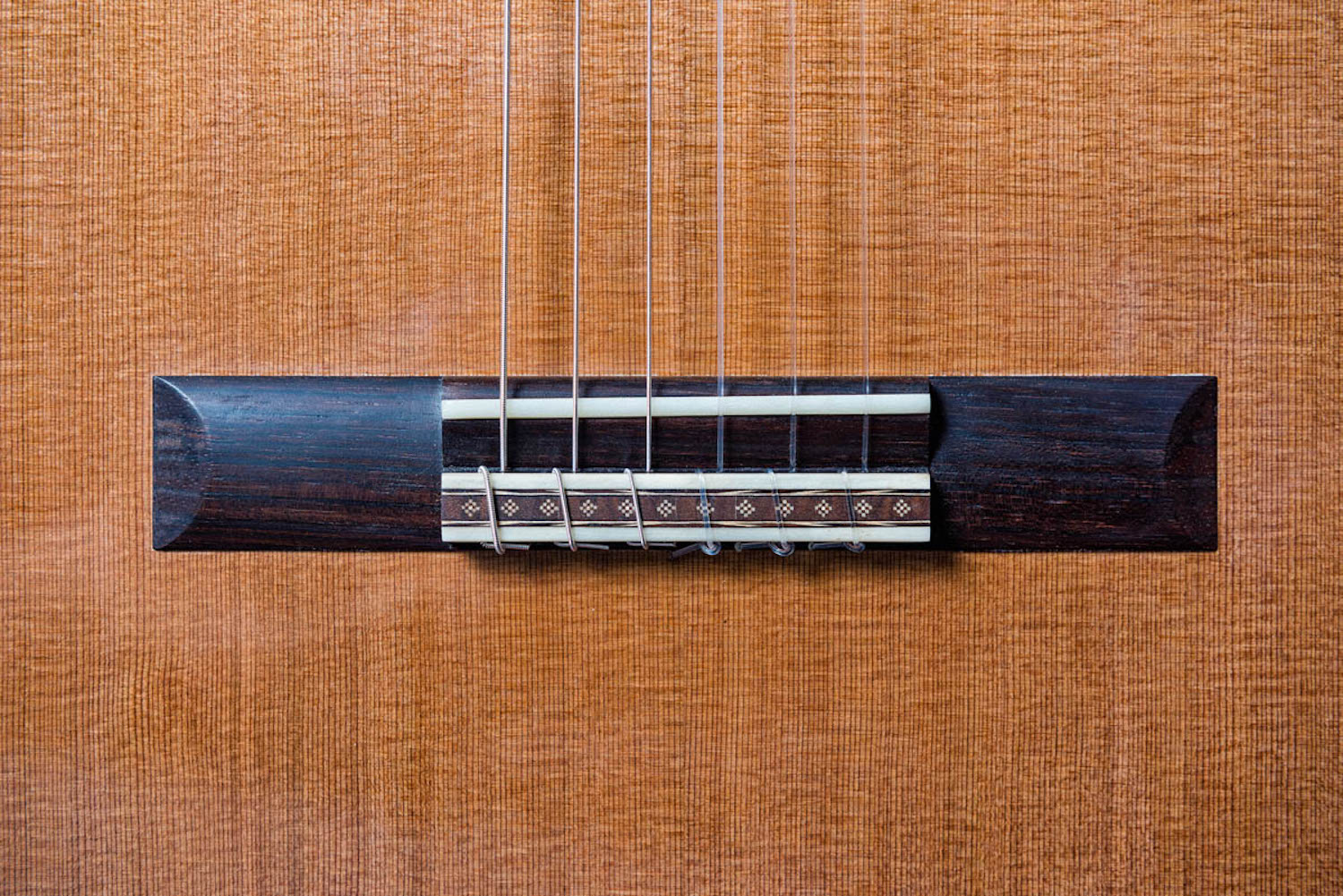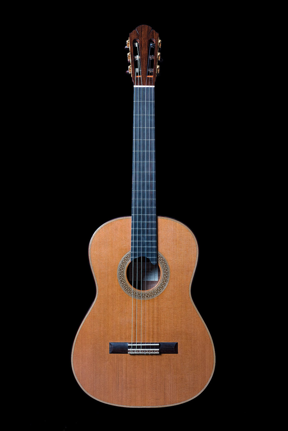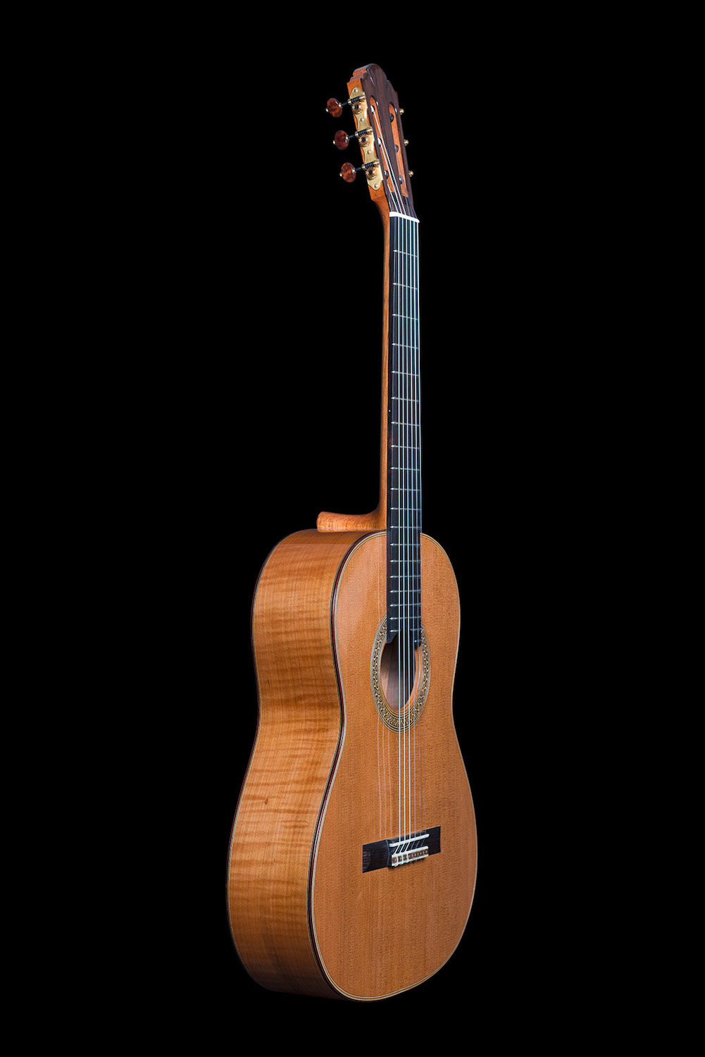 This guitar with cedar soundboard is the very first I have made with back and sides of one of the most magical woods I know: sorb tree, also called whitty pear or, with its botanic name, sorbus domestica. Some further information about this wood can be found on my blog page. Tuners: Scheller with snakewood buttons.